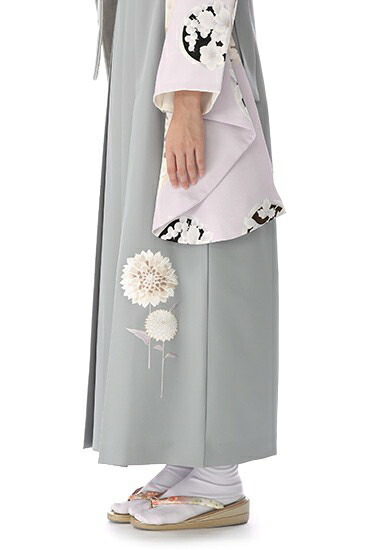 合わせる袴は、「空色鼠(そらいろねず)」と呼ばれる、薄曇りの空のような青みを含んだ明るい灰色。江戸後期に流行した伝統色で、薄く曇った天気のわずかに明るい空模様を見事に表現した粋な色。天気や自然を表現した色は、日本人らしい繊細な美意識から生まれたものです。