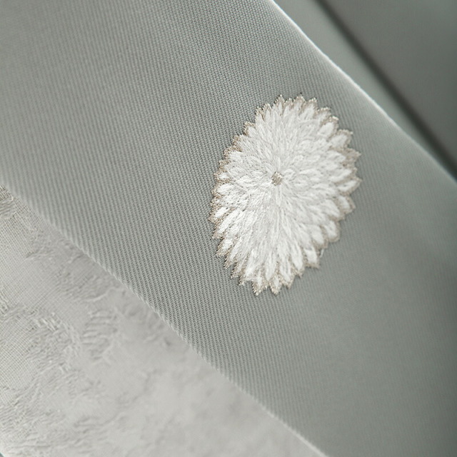 合わせる袴は、「空色鼠(そらいろねず)」と呼ばれる、薄曇りの空のような青みを含んだ明るい灰色。江戸後期に流行した伝統色で、薄く曇った天気のわずかに明るい空模様を見事に表現した粋な色。天気や自然を表現した色は、日本人らしい繊細な美意識から生まれたものです。