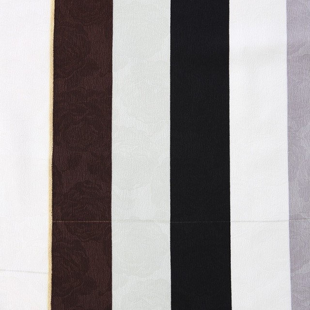 着物には、白色、黒色、茶色、グレーで「縞柄」が描かれています。直線は厄除けの意味があるので、縁起のよい古くから人々に親しまれた文様です。古くから伝わる文様ですが、ストライプなので現代っぽさもあり、レトロですがモダンな雰囲気もある格好良い着物に仕上がりました。