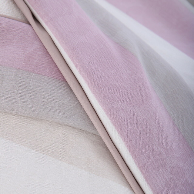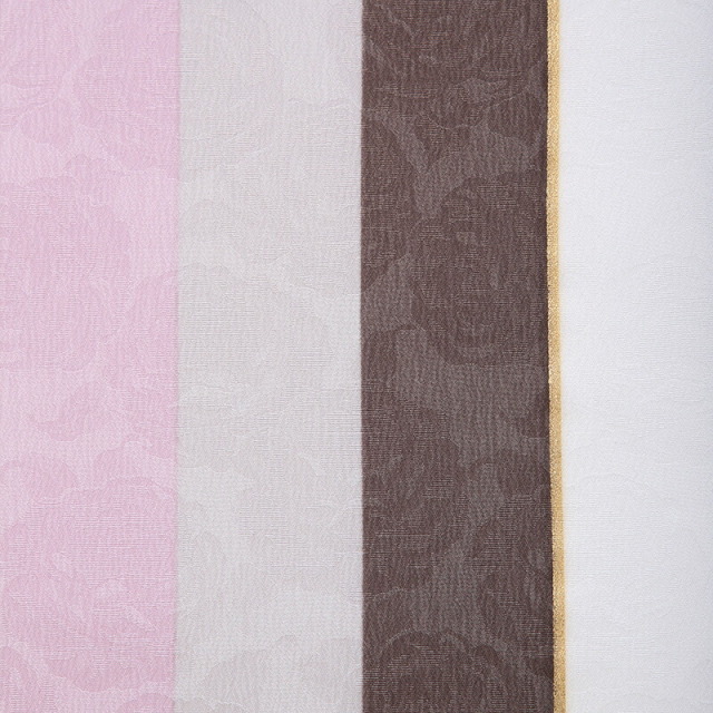 少しくすんだピンクに、グレー、茶色、白色で「縞柄」が描かれます。現代でもストライプはよく目にする身近な柄ですが、直線は厄除けの意味があるので、古くから人々に親しまれた縁起のいい文様です。