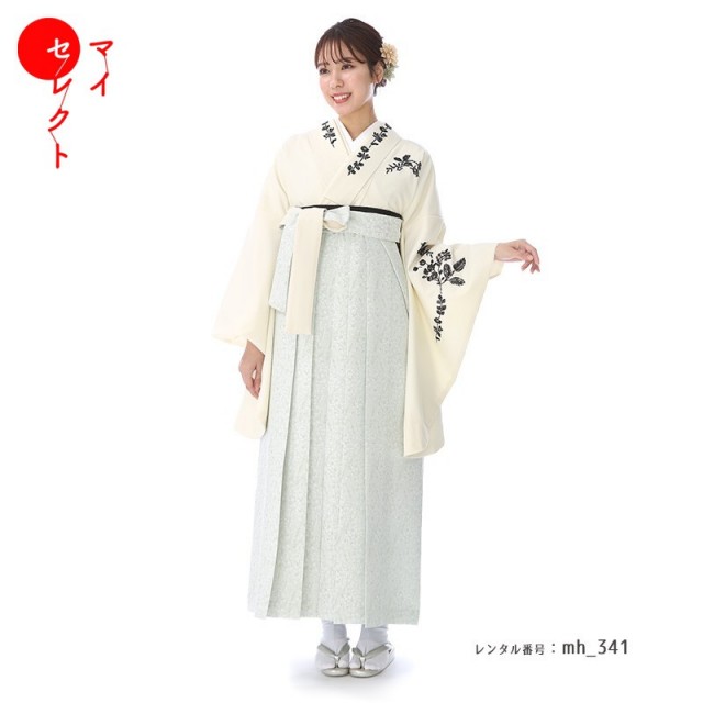 ナチュラルな「生成色(きなりいろ)」の着物に、薄いグリーンの袴を合わせた、透明感溢れる上品なコーディネート。