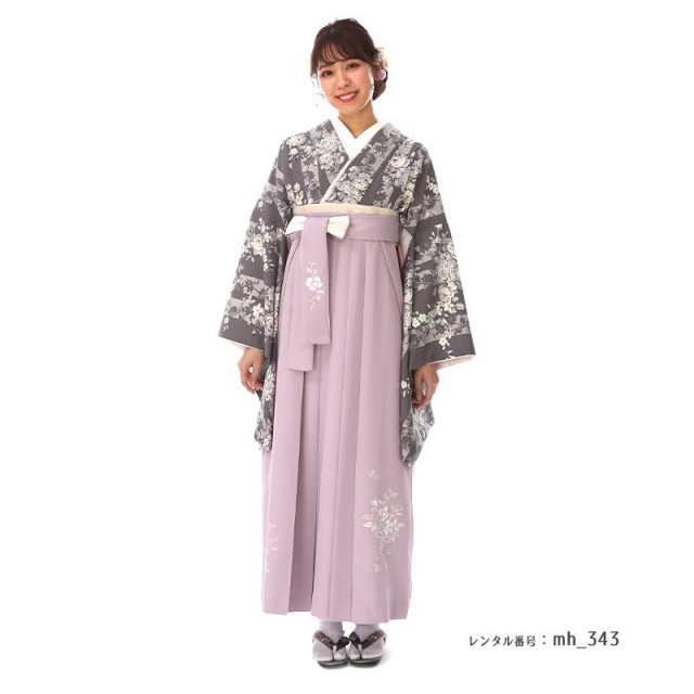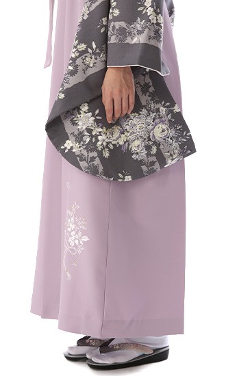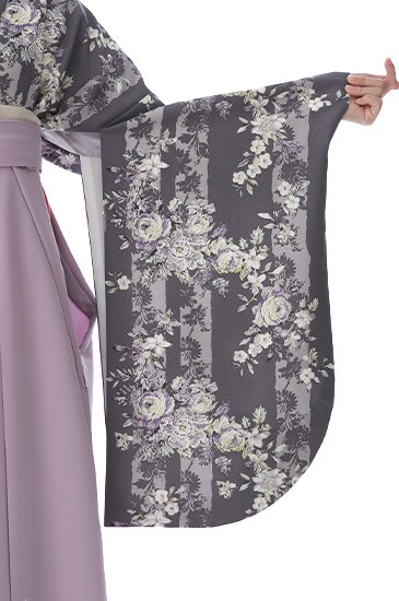 袴の、淡い紫色は「紅藤(べにふじ)」と呼ばれる伝統色で、やや赤みがかった藤色です、江戸後期に、若い女性向けに人気が出た優しく女性らしいカラーです。そして着物の地色は、「藤煤竹(ふじすすたけ)」。その名の通り、藤色に煤がかった暗い灰紫色です。同じ藤色でもこのような差があり、日本特有の美意識を感じる色合わせです。