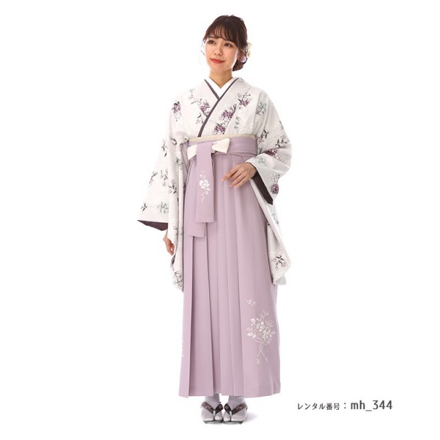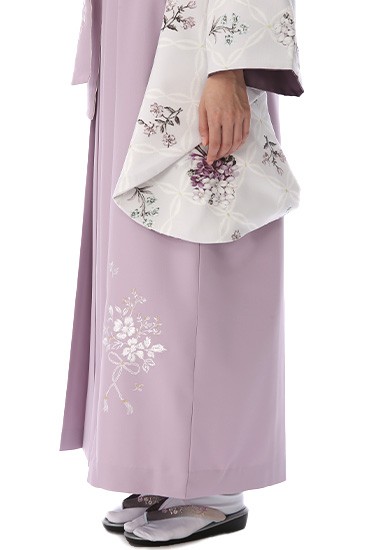 清楚な雰囲気が大人かわいいコーディネートの紹介です。袴の、淡い紫色は「紅藤(べにふじ)」と呼ばれる伝統色で、やや赤みがかった藤色です、江戸後期に、若い女性向けに人気が出た優しく女性らしいカラーです。