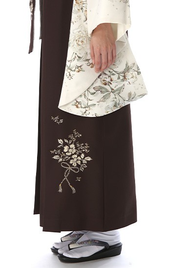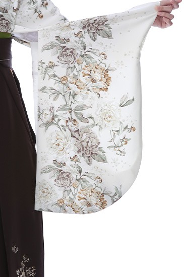 着物地には、繊細なタッチで「牡丹」が描かれます。牡丹はたくさんの花弁があり「百花の王」と呼ばれており、富貴、高貴、幸福を表しています。また、袴には、お祝いの日にぴったりの、ブーケの模様が刺繍で施されます。