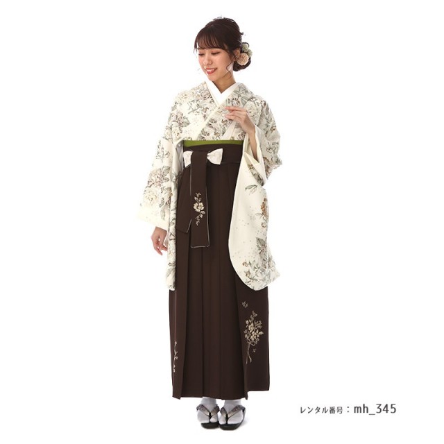 優しい雰囲気で、上品な可愛さが魅力の卒業袴です。袴の黒みがかった茶色は「焦茶(こげちゃ)」。江戸時代に流行した伝統色です。着物地の、真っ白ではない肌馴染みのいいナチュラルカラーは「生成色(きなりいろ)」です。晒す前の木綿のようなわずかに赤みがかったアイボリーで、肌を明るくみせてくれるカラーなので、写真撮影の多い卒業式におすすめです。