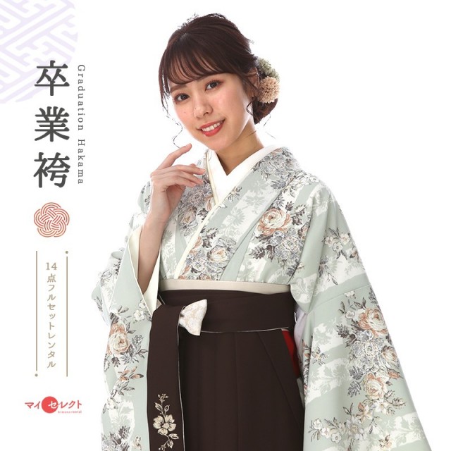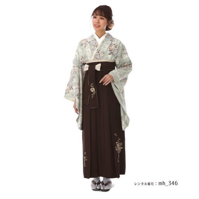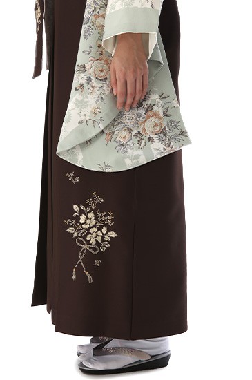 着物の地色は、その名の通り「薄緑(うすみどり)」と呼ばれ、淡い優しい雰囲気にみせてくれるカラーです。袴の黒みがかった茶色は「焦茶(こげちゃ)」で、江戸時代に流行した伝統色です。