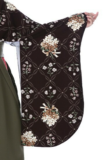 そして着物の地模様には、「七宝つなぎ」が描かれています。七宝は円形が永遠に繋いでいくということから、繁栄、円満の意味が込めれています。また、人との縁には七宝と同じくらい価値があるといわれ、晴れ着に相応しい文様です。また可愛いブーケの模様が、着物にも袴にも描かれます。