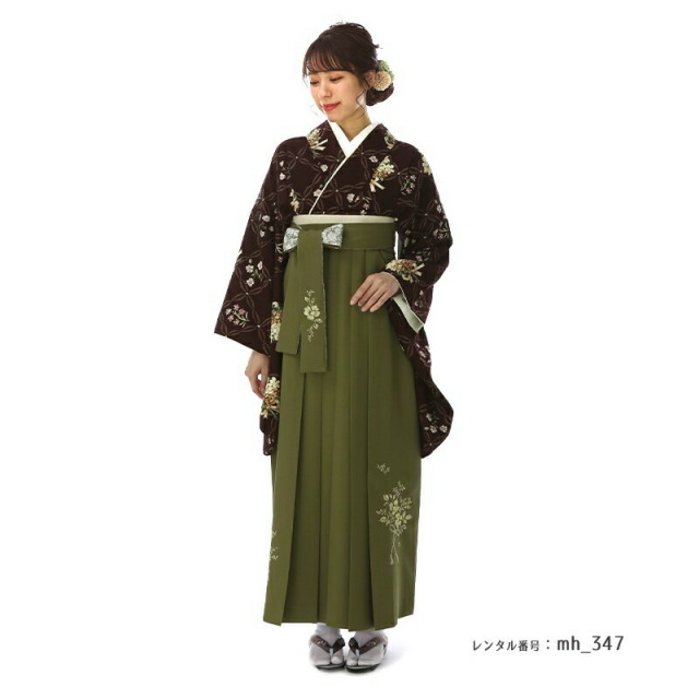 落ち着いた大人可愛いデザインが魅力のこちらの晴れ着。着物地の黒みがかった茶色は「焦茶(こげちゃ)」。袴の、やや茶みがかった黄緑色は「岩井茶(いわいちゃ)」と呼ばれ、ともに江戸時代から伝わる伝統色です。