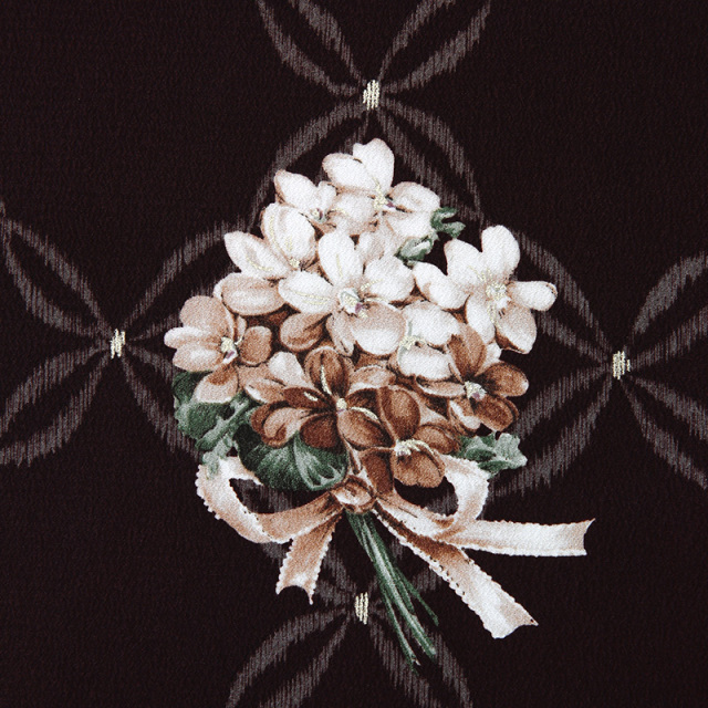 古典的で、おめでたい意味が込められた七宝と、現代風のブーケの文様が非常にバランスがよく仕上がっています。上品な装いは、人生の大切なお祝いのシーンに華を添えてくれることでしょう。