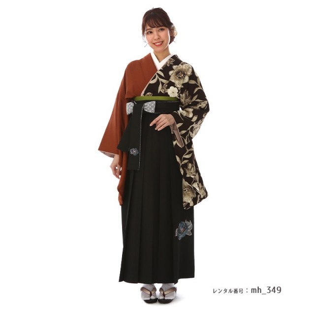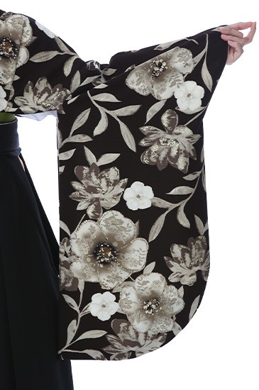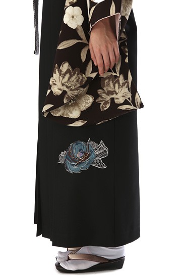 落ち着いたダークな色合わせは、穏やかで大人っぽい魅力を引き立たせてくれます。着物の地色は「茶色(ちゃいろ)」。茶の葉で染めた色で、栗の実のような深みのあるカラーです。そこに黒地の着物と袴を合わせて、全体をシックに引き締め、大人可愛い雰囲気になりました。