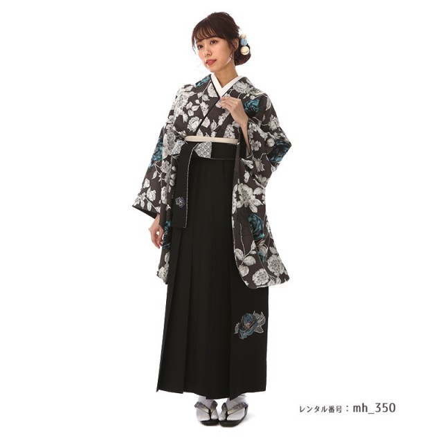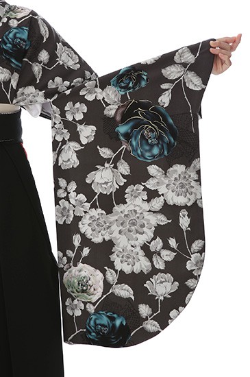 大人可愛い、上品で個性的なデザインの卒業式袴です。着物地の濃いグレーは「吉岡染(よしおかぞめ)」。染や色の名前としては、個人の名を冠した最も古い例であり、江戸前期に流行した伝統色です。同系の黒を袴を合わせて、お洒落なワントーンコーデになっています。