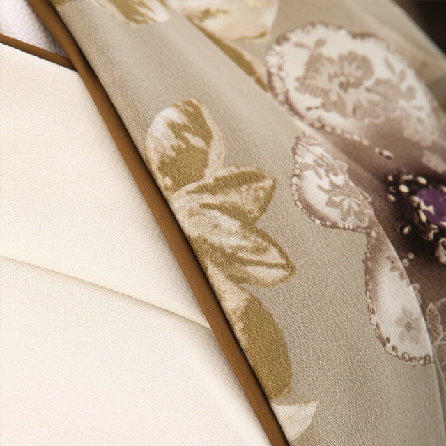 そして少し濃いベージュカラーで、片身替わりのお洒落なデザインです。お花は特定されるものではなく抽象的に描き、幻想的でどこか懐かしい気持ちにしてくれるレトロモダンスタイル。