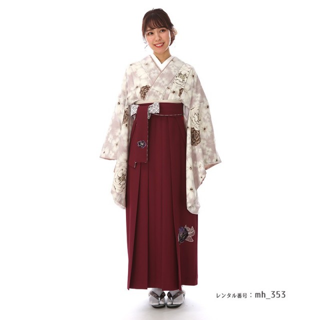 | 付属品 | 着物・袴・長襦袢(半衿付き)・半幅帯・伊達衿・草履・足袋(プレゼント)・肌襦袢(ワンピースタイプ)・腰紐4本・コーリンベルト・前板・伊達締め2本・衿芯 ※ブーツは付属されませんが、当店の有料オプションからレンタル可能です。 ※ブーツをご利用される場合、草履・足袋は付属されません。 |