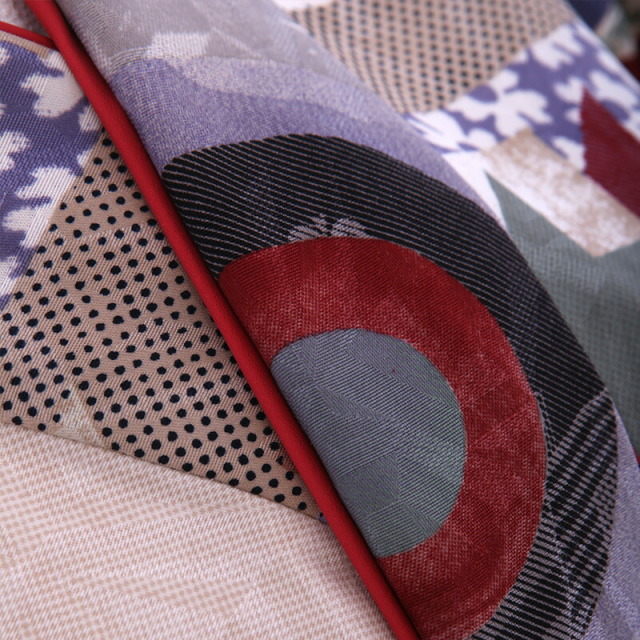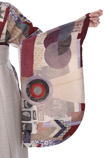 そして、着物地にはモダンな雰囲気の、「幾何学文様(きかがくもんよう)」が描かれます。直線、曲線、点などの幾何学的な図形を文様の素材として用いた文様です。中に、花々や月の文様を描いていて、更にインパクトがある個性的なデザインに仕上がっています。