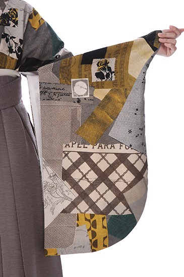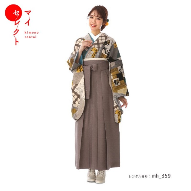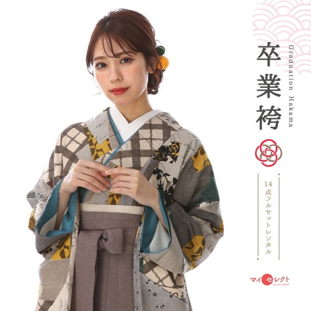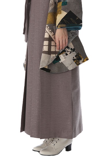 大胆な文様を描き方がお洒落な卒業式袴の紹介です。袴の灰がかった黄褐色は「胡桃染(くるみぞめ)」と呼ばれる伝統色。山野に自生する胡桃の樹皮や果皮の煎汁と灰汁で染めた色とされた色味が使用されています。