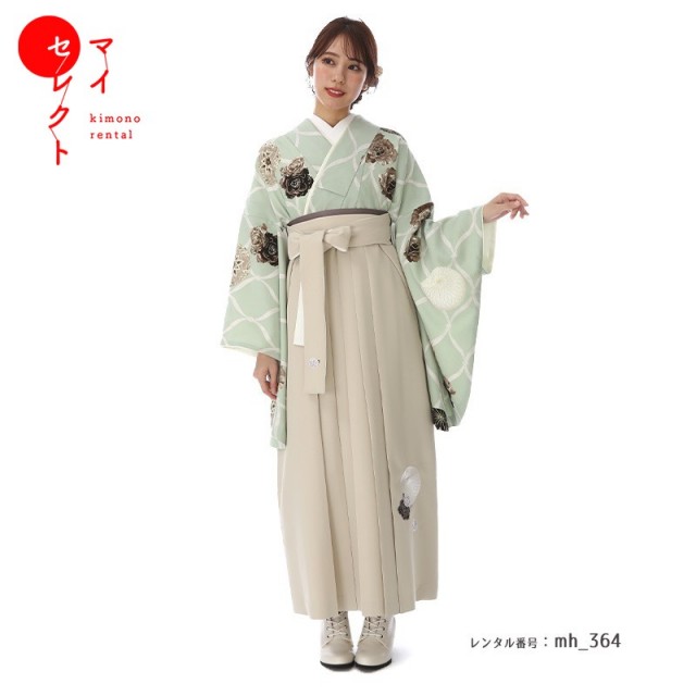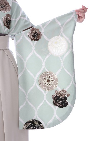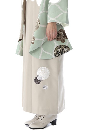 可愛い文様を、モダンに描いた落ち着いた可愛さが魅力のスタイルです。着物地のくすんだグリーンは「裏葉色(うらはいろ)」。木の葉や草の葉裏のような渋くくすんだ薄緑色で、爽やかで清潔感のある色味です。袴の薄茶色は「亜麻色(あまいろ)」と呼ばれ、亜麻を紡いだ糸の色のような柔らかさがあります。