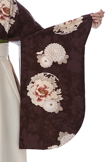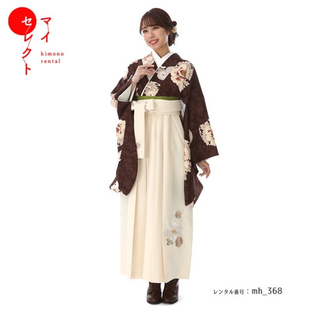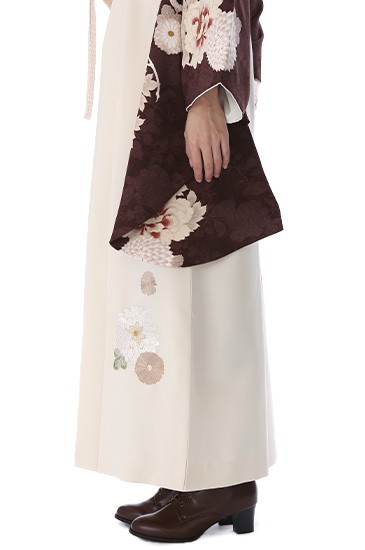 着物地の深く渋い茶色は「黒柿(くろがき)」。江戸前期からの色で、その名の通り黒みの柿色が由来しています。そして袴には優しいアイボリー。真っ白ではない肌馴染みのいいナチュラルカラーです。