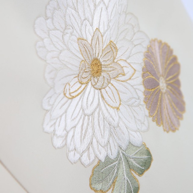描かれる文様は、縁起のいい美しい花々。「菊」は花の形から太陽を連想させ、最も位の高い花とされ、邪気を払い、長寿と保てるとされています。「牡丹」はたくさんの花弁があり「百花の王」と呼ばれ、富貴、高貴、幸福を表しています。