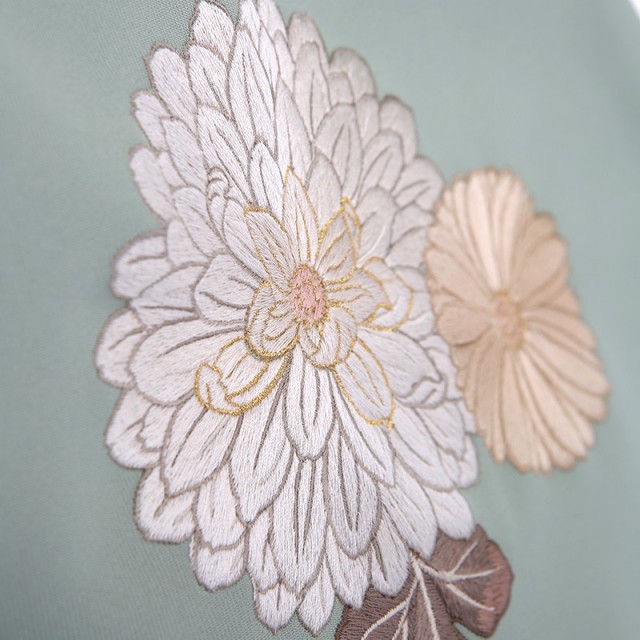 淡いペールグリーンはその名の通り「薄緑(うすみどり)」。上品で女性らしい色味です。着物地は、わずかの緑みを帯びた暗い青色は「鉄紺(てつこん)」です。ともに古くから伝わる伝統色です。
