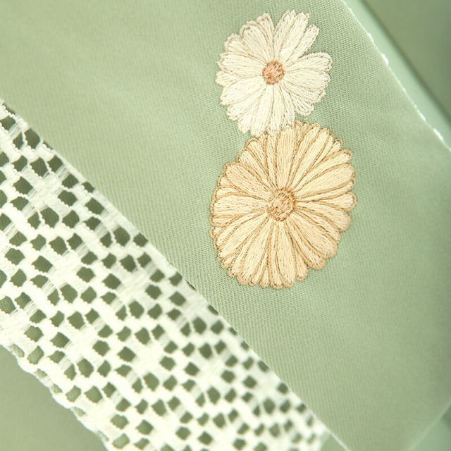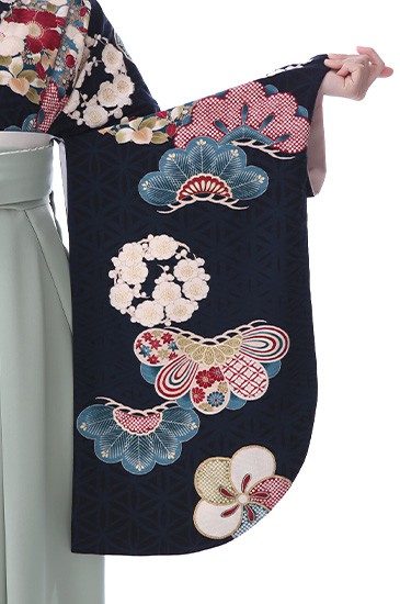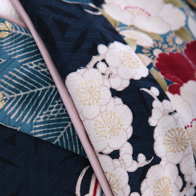 淡いペールグリーンはその名の通り「薄緑(うすみどり)」。上品で女性らしい色味です。着物地は、わずかの緑みを帯びた暗い青色は「鉄紺(てつこん)」です。ともに古くから伝わる伝統色です。