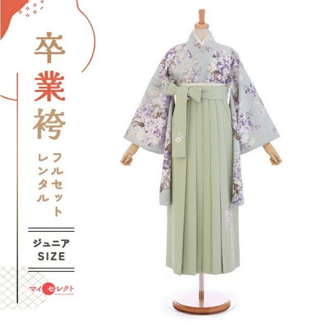 上品で可憐な雰囲気が魅力の着物です。着物地のペールブルーは「白藍(しらあい)」。藍染の中で最も薄い色です。袴のグリーンは「裏葉色(うらはいろ)」。木の葉や草の葉裏のような渋くくすんだ薄緑色で、ともに爽やかで清潔感のある色味が使用されます。