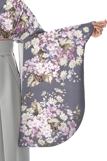 スモーキーな色合わせで、可愛らしい花々の文様を落ち着いた雰囲気に演出してくれます。着物地の深みのある紫色は「鳩羽色(はとばいろ)」。その名の通り、鳩の羽のような灰みがかったカラーで明治以降に着物の色として流行しました。