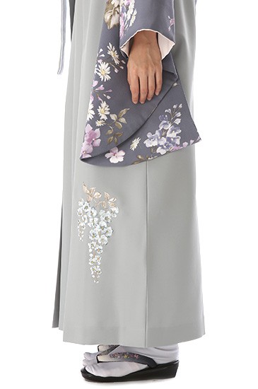 そして着物に描かれる「菫(スミレ)」は、道ばたで春に花を咲かせる野花です。まだ寒さのある時季に咲く様は人々に共感を与えるものとして、文様化されました。健気で愛らしさを感じます。袴に描かれる「藤」は、他の樹木に絡みながら蔓を伸ばしていく様子から長寿や子孫繁栄の象徴とされてきました。