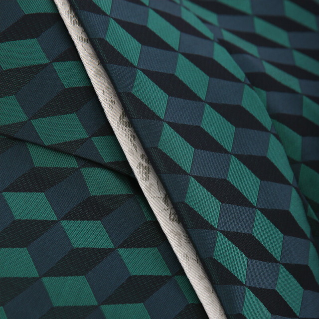 そして、着物には「グラフィカル柄」が描かれます。60年代プリントの代表的なモチーフです。ダイナミックにグリーンの強めカラーをミックスして、目を楽しませてくれます。