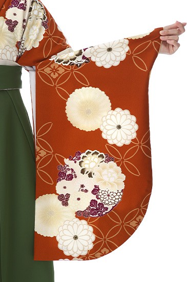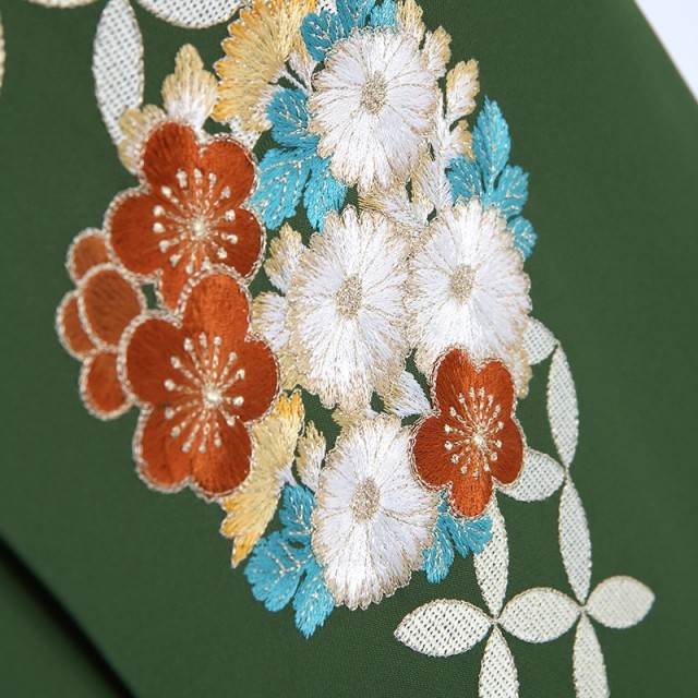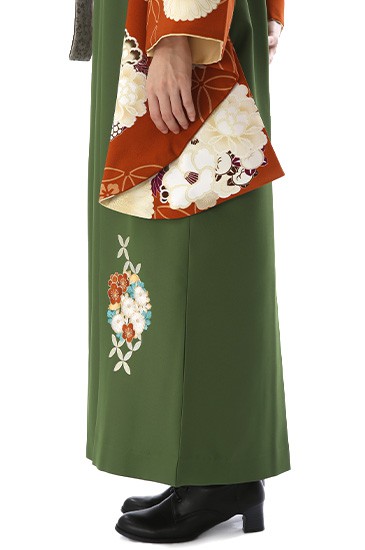 着物の濃い緑色は「柚葉色(ゆずはいろ)」。文字通り柚子の葉に由来する色です。袴の朱色は「紅柑子(べにこうじ)」。ミカン科のベニコウジの果実のような深みのある美しい色味が使用されています。