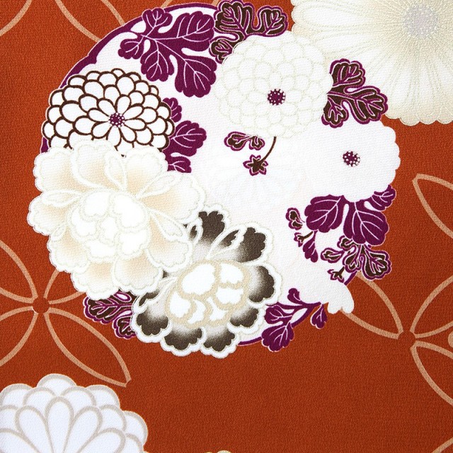 着物には縁起のいい吉祥文様が沢山描かれます。「七宝」は円形が永遠に繋いでいくということから、繁栄、円満の意味が込めれています。草花が丸く描かれた「花丸紋」は、角がなく優しさがあり清楚な印象を与えます。そして丸い円は始まりも終わりもないということから、永遠に続く幸せを表現しています。また円は「縁」を連想させるので、門出のお祝いにぴったりな文様です。