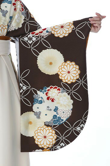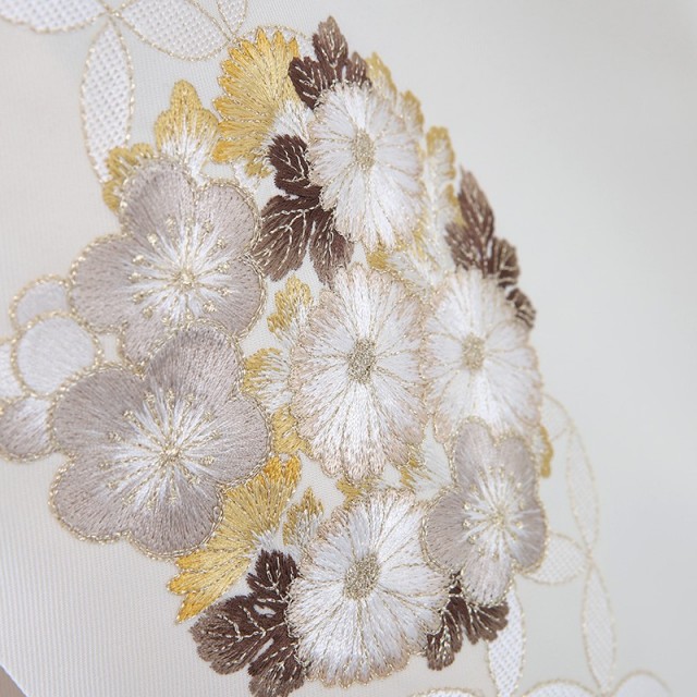 モノクロの着物に、美しい文様がよく映える上品な装いです。草花が丸く描かれた「花丸紋」は、角がなく優しさがあり清楚な印象を与えます。そして丸い円は始まりも終わりもないということから、永遠に続く幸せを表現しています。また円は「縁」を連想させるので、門出のお祝いにぴったりな文様です。