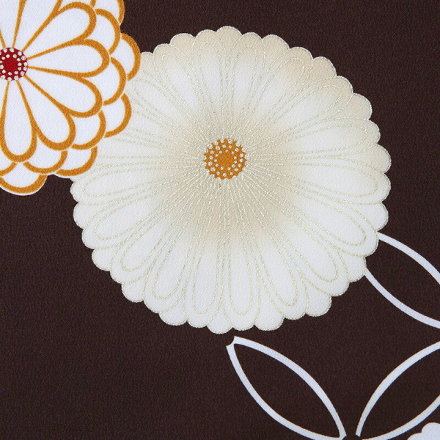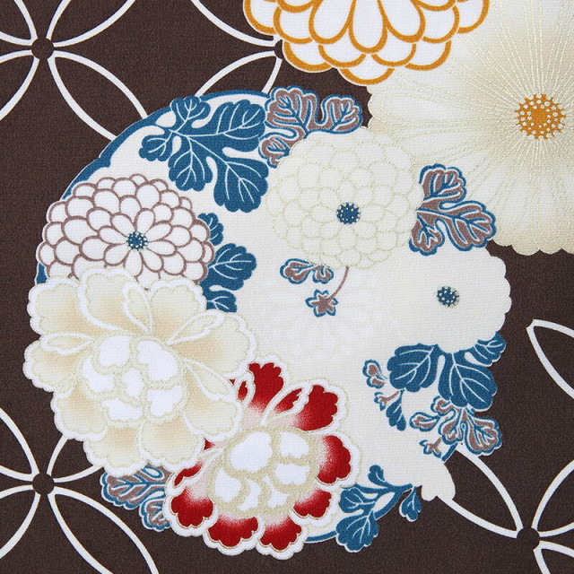 中に描かれる美しい花々たち。「菊」は、花の形から太陽を連想させ、最も位の高い花とされ、また邪気を払い、長寿と保てるとされています。「牡丹」はたくさんの花弁があり「百花の王」と呼ばれ、富貴、高貴、幸福を表しています。「七宝」は円形が永遠に繋いでいくということから、繁栄、円満の意味が込めれています。