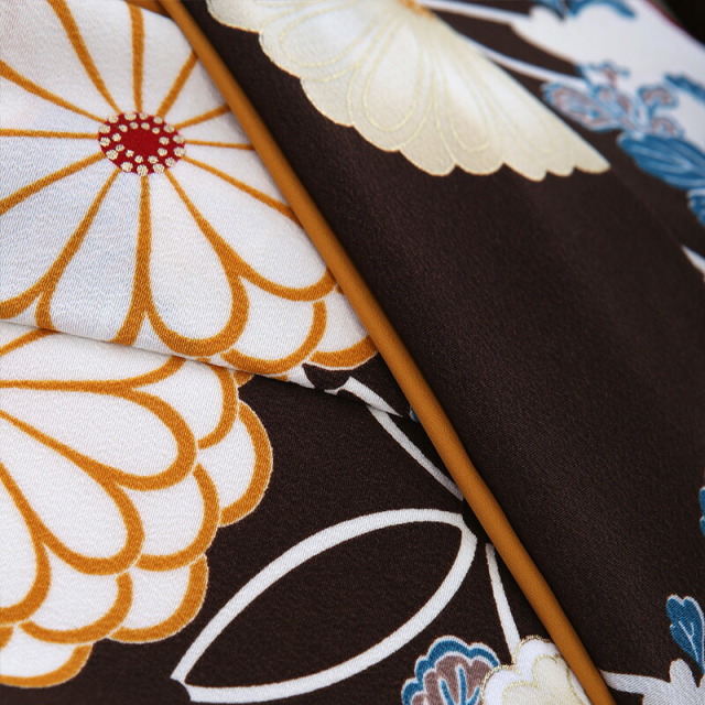 中に描かれる美しい花々たち。「菊」は、花の形から太陽を連想させ、最も位の高い花とされ、また邪気を払い、長寿と保てるとされています。「牡丹」はたくさんの花弁があり「百花の王」と呼ばれ、富貴、高貴、幸福を表しています。「七宝」は円形が永遠に繋いでいくということから、繁栄、円満の意味が込めれています。