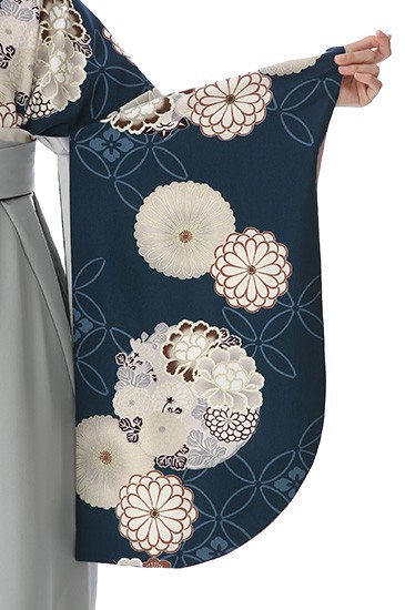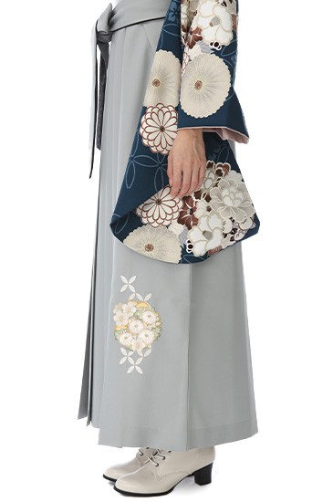 着物地の暗い青色は「二重緑(ふたえみどり)」と呼ばれます。「藍色(あいいろ)」と「黄蘗(きはだ)」を染め重ねた濃い色合いで、やや緑みを感じる深みのあるカラーです。袴の明るいグレーは「銀色(ぎんいろ)」。白金とも呼ばれる、美しい金属光沢のあり、落ち着いた上品さがあります。