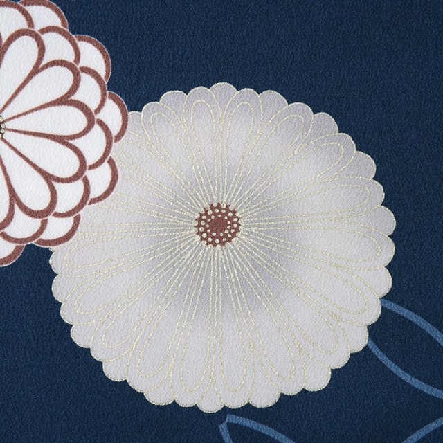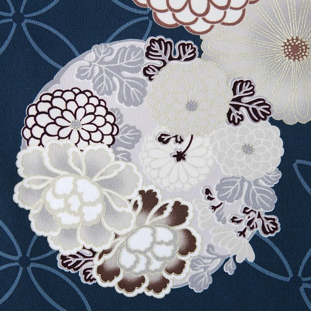 中に描かれる美しい花々たち。「菊」は、花の形から太陽を連想させ、最も位の高い花とされ、また邪気を払い、長寿と保てるとされています。「牡丹」はたくさんの花弁があり「百花の王」と呼ばれ、富貴、高貴、幸福を表しています。「七宝」は円形が永遠に繋いでいくということから、繁栄、円満の意味が込めれています。