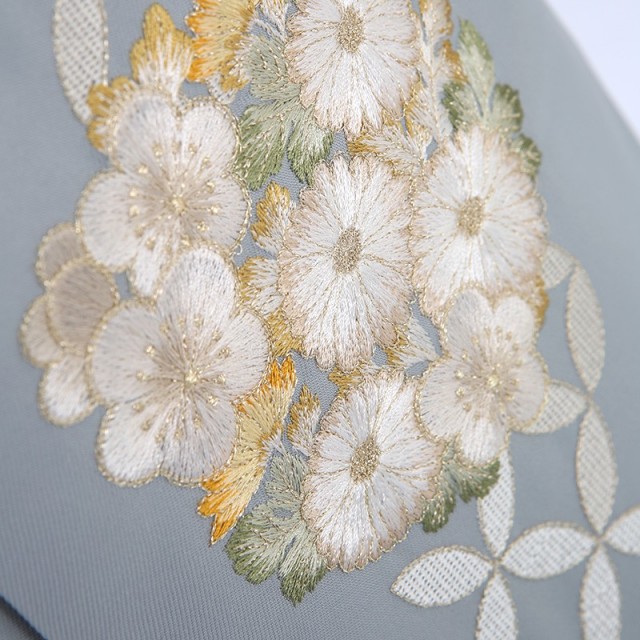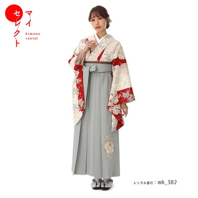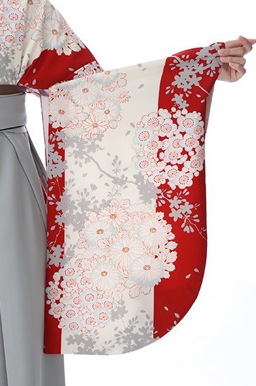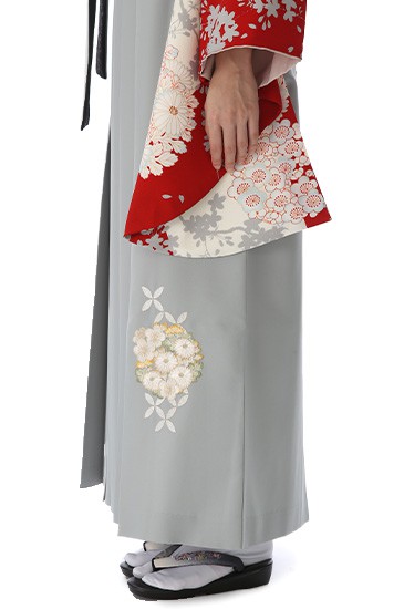 縁起のいい紅白のカラーに美しい花々が咲き誇る、おめでたい日にぴったりの装いです。「赤色」は厄除けの意味が込めれらており、お守りのような存在です。そして袴の明るいグレーは「銀色(ぎんいろ)」。白金とも呼ばれる、美しい金属光沢のあり、落ち着いた上品さがあります。