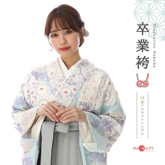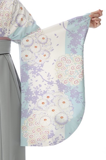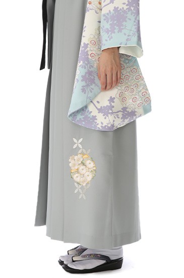晴れた日のような明るいカラ―、古典的な花々を描いた装いです。着物地の淡いブルーは「白縹(しろはなだ)」。そして白色を合わせることで清潔感のある上品な雰囲気になっています。袴の明るいグレーは「銀色(ぎんいろ)」。白金とも呼ばれる、美しい金属光沢のあり、落ち着いた上品さがあります。