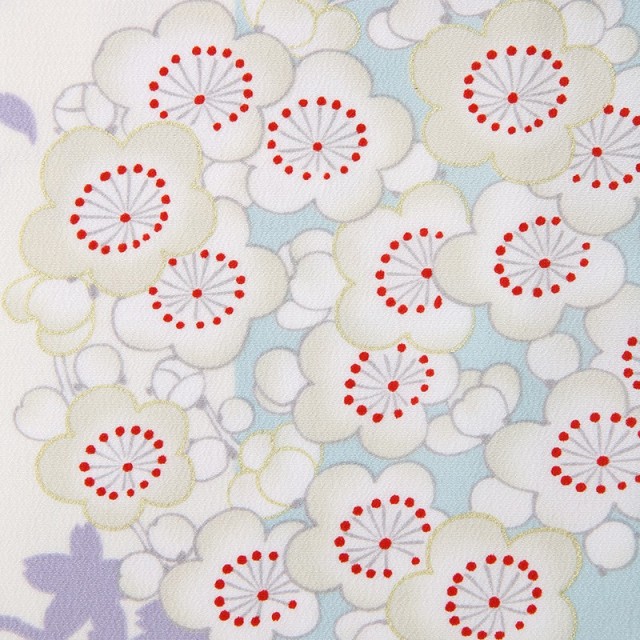 着物には満開の「梅」が咲き誇ります。梅は厳しい冬が終わるといち早く香り高き花を咲かせることから、逆境に負けない力強さ、忍耐力や生命力をあらわす、新春を代表する吉祥文様です。また、「菊」は花の形から太陽を連想させ、最も位の高い花とされ、邪気を払い、長寿と保てるとされています。