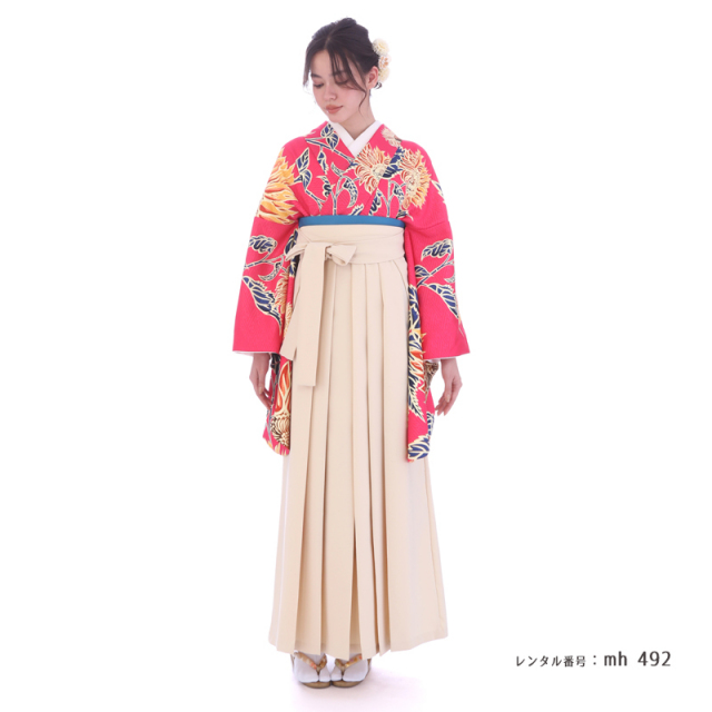 | 付属品 | 着物・袴・長襦袢(半衿付き)・半幅帯・伊達衿・草履・足袋(プレゼント)・肌襦袢(ワンピースタイプ)・腰紐4本・コーリンベルト・前板・伊達締め2本・衿芯 ※ブーツは付属されませんが、当店の有料オプションからレンタル可能です。 ※ブーツをご利用される場合、草履・足袋は付属されません。 |