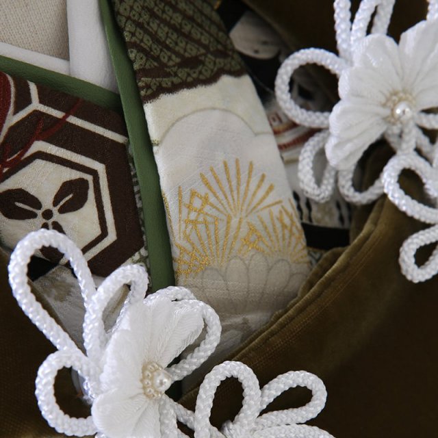 上品で落ち着いたグリーン系でまとめられた男の子のお祝い着です。被布の黄緑色は「鶯茶(うぐいすちゃ)」と呼ばれる伝統色。鶯の羽のような褐色がかった渋みのある黄緑色で、江戸時代には落ち着いた色味として非常に人気が出ました。そして着物に描かれる文様は、おめでたい意味が込められた吉祥文様ばかりです。凛々しい「兜」は、戦で頭を守る為に使用された道具です。身体の中でとくに大切な頭を守るということから災いから守り、長い人生ずっと健康でありますようにというお守りの意味が込められます。また格が高い武士でないと着用できなかったことから、出世や大成の願いが込められています。一年中美しい緑を保ち続ける「松」は、不老不死や長寿の象徴とし、力強さ、生命力を表しています。美しい色合いが素敵なこちらの装いは、文様も大切な願いばかりです。大切な晴れの日にぴったりの古典的で正統派な装いに仕上がりました。