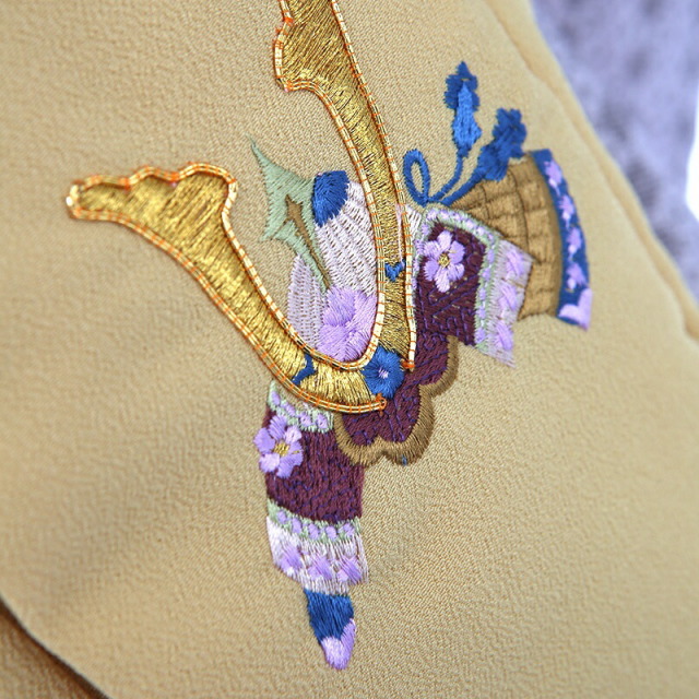 優しく控えめな印象に仕上がってるこちらの装い。色味は大人っぽいイメージで、そこに描かれる文様は古くから伝わるおめでたい吉祥文様です。被布の淡い黄色は「淡黄(たんこう)」。平安時代の重ねの表地の色としても用いられていました。純粋な黄色よりも優しいイメージの色です。「兜」は、戦で頭を守る為に使用されてきた道具です。大切な頭を守るということから、災いから守り、長い人生で健康でありますようにというお守りの意味があります。また格が高い位でないと着用できないものなので、出世や大成の願いも込められます。「打出の小槌」は一生物に困らないように、お金に困らないようにという意味があります。着物地にも文様が描かれてモダンな雰囲気。お洒落さもありながら、しっかりと大切な想いは着物に託せる、そんな一着に仕上がりました。