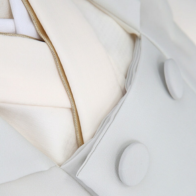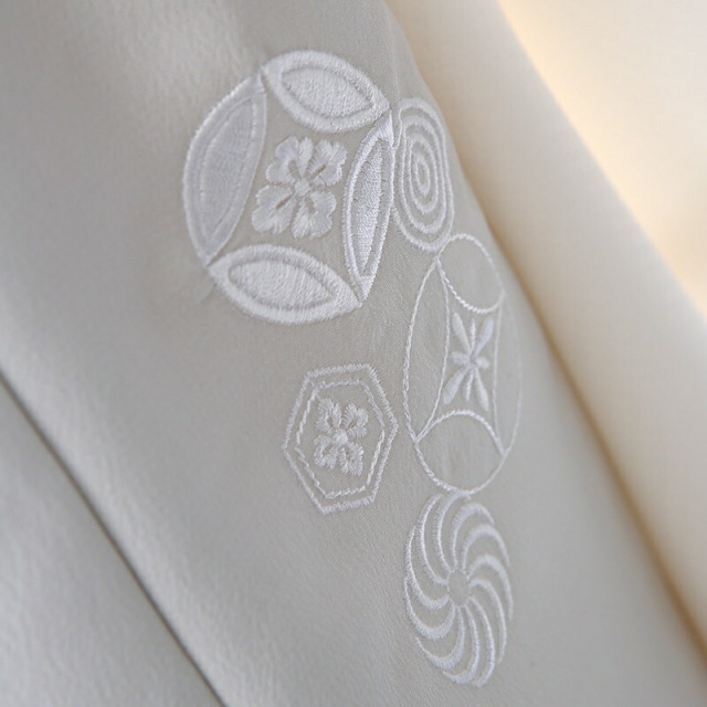 被布の薄い青みを含んだ白色は「月白(げっぱく)」と呼べれる月の光のような色味です。月が東の空に昇るの際に空がだんだん明るく白んでいく様子を指し、文学的で風流さを感じさせる色名です。着物地のほぼ白色に見える黄色のカラーは「白百合色(しらゆりいろ)」。その名の通り、白百合の花のような優しい色味で、透き通るような白い肌の意味など使われます。どちらも上品で優しい色味です。ほぼ無地にみえますが、被布に文様がさりげなく描かれます。「七宝花菱」、「亀甲花菱」が描かれます。花菱は有職文様といって、平安時代以降、公家の装飾や建築に使われていたことなどから、高貴さや上品といった意味があります。「七宝」は、更なる繁栄、円満、調和、ご縁などの願いが込められており、「亀甲」は、亀は長寿を表しています。そして「菊」が「ねじり菊」とう文様で描かれます。菊は、太陽のように咲く姿から最も位の高い花とされ高貴さをあらわしています。シンプルだからこそ、他とは被らない品のある華やかさを感じます。写真撮影でも映えること間違いなし、おすすめの一着です。
