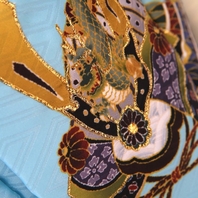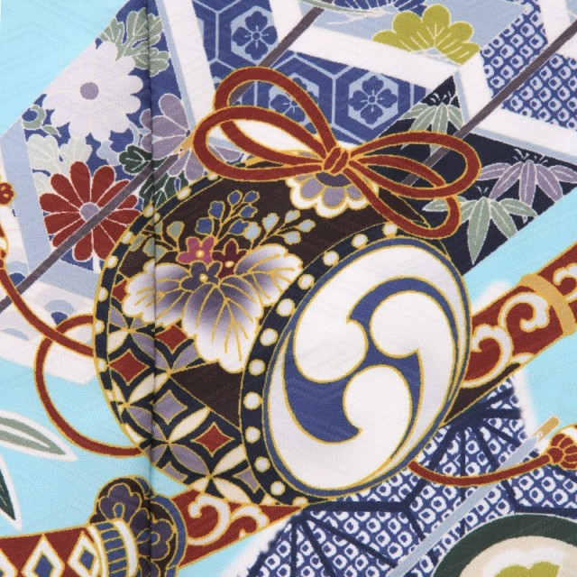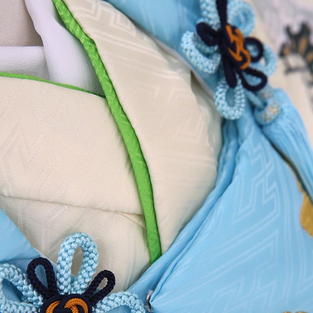 被布と着物地の淡い明るいブルーは「薄水色(うすみずいろ)」。文字通り水色を薄くしたような、淡い青緑色のことで、まさに晴れの日にぴったりなカラーです。文様は古典的で男の子らしい王道のものが描かれます。被布に描かれる「兜」。兜は、戦で頭を守る為に使用されてきた道具です。大切な頭を守るということから、災いから守り、長い人生で健康でありますようにというお守りの意味があります。また格が高い位でないと着用できないものなので、出世や大成の願いも込められます。「龍」は、神聖なる霊獣として尊ばれ、権力を手にした皇帝を象徴するシンボルとなり、さまざまな装飾に用いられ、強い力の象徴として好まれてきました。また、日本では水を司る神として、人々の信仰を深めたとされています。「打出の小槌」は一生物に困らないように、お金に困らないようにという意味があります。爽やかな色味に、おめでたい意味が込められた吉祥文様、飽きのこない正統派な装いです。