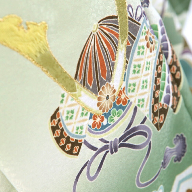 ふわっとした優しいカラーが上品で落ち着きを感じるお祝い着です。着物地のほぼ白色に見える黄色のカラーは「白百合色(しらゆりいろ)」。その名の通り、白百合の花のような優しい色味で、透き通るような白い肌の意味などに使われます。そして被布の明るいグレーは「白鼠(しろねずみ)」。こちらも上品で明るい色味が使用されます。着物には地模様がなく非常にシンプル、被布にさりげなく文様が描かれます。「七宝花菱」、「亀甲花菱」が描かれます。花菱は有職文様といって、平安時代以降、公家の装飾や建築に使われていたことなどから、高貴さや上品といった意味があります。「七宝」は、更なる繁栄、円満、調和、ご縁などの願いが込められており、「亀甲」は、亀は長寿を表しています。そして「菊」が「ねじり菊」とう文様で描かれます。菊は、太陽のように咲く姿から最も位の高い花とされ高貴さをあらわしています。淡い色合わせに、大切な意味を込めた文様をさりげなく描いた、上品で大人っぽい一着です。
