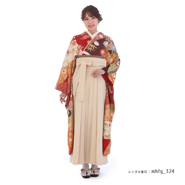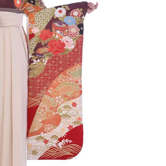 | 付属品 | 着物・袴・長襦袢(半衿付き)・半幅帯・伊達衿・巾着・草履・足袋(プレゼント)・肌襦袢(ワンピースタイプ)・腰紐4本・コーリンベルト・前板・伊達締め2本・衿芯 ※ブーツは付属されませんが、当店の有料オプションからレンタル可能です。 ※ブーツをご利用される場合、草履・足袋は付属されません。 |
