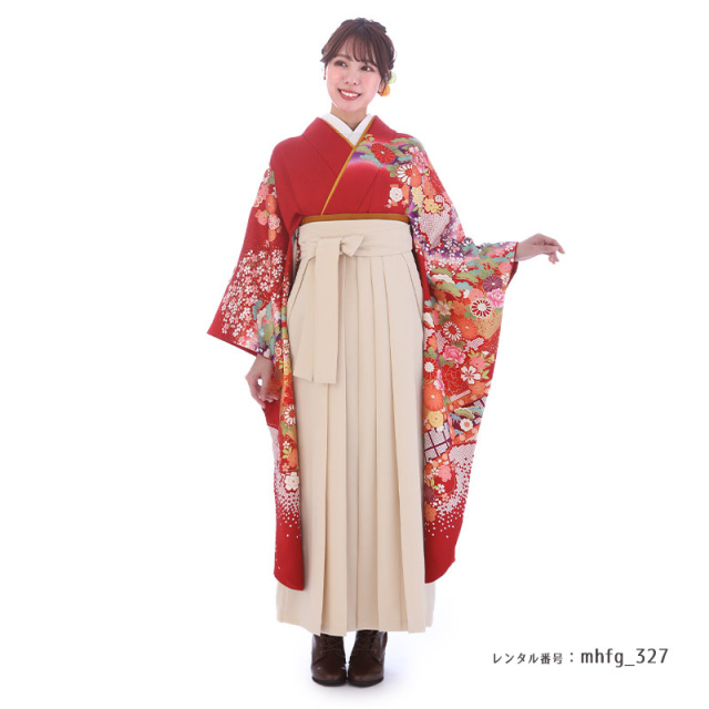 | 付属品 | 着物・袴・長襦袢(半衿付き)・半幅帯・伊達衿・巾着・草履・足袋(プレゼント)・肌襦袢(ワンピースタイプ)・腰紐4本・コーリンベルト・前板・伊達締め2本・衿芯 ※ブーツは付属されませんが、当店の有料オプションからレンタル可能です。 ※ブーツをご利用される場合、草履・足袋は付属されません。 |