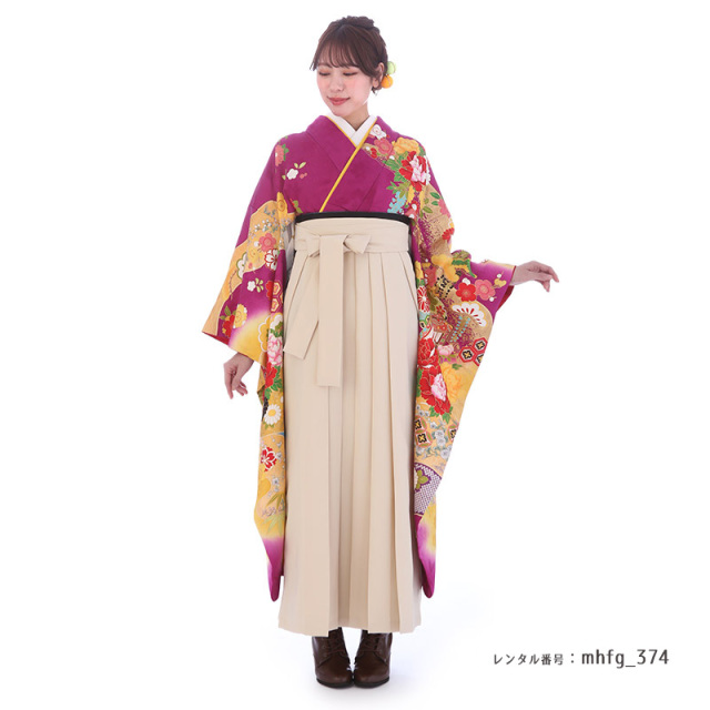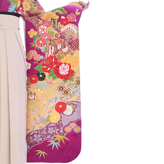 | 付属品 | 着物・袴・長襦袢(半衿付き)・半幅帯・伊達衿・巾着・草履・足袋(プレゼント)・肌襦袢(ワンピースタイプ)・腰紐4本・コーリンベルト・前板・伊達締め2本・衿芯 ※ブーツは付属されませんが、当店の有料オプションからレンタル可能です。 ※ブーツをご利用される場合、草履・足袋は付属されません。 |