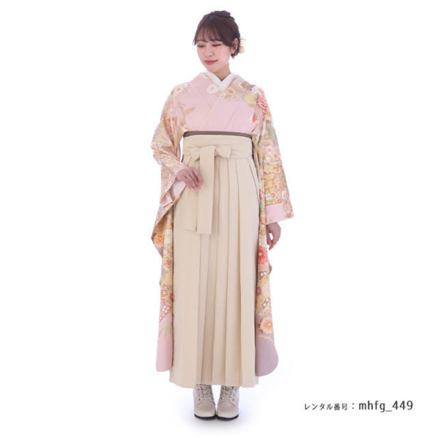 | 付属品 | 着物・袴・長襦袢(半衿付き)・半幅帯・伊達衿・巾着・草履・足袋(プレゼント)・肌襦袢(ワンピースタイプ)・腰紐4本・コーリンベルト・前板・伊達締め2本・衿芯 ※ブーツは付属されませんが、当店の有料オプションからレンタル可能です。 ※ブーツをご利用される場合、草履・足袋は付属されません。 |