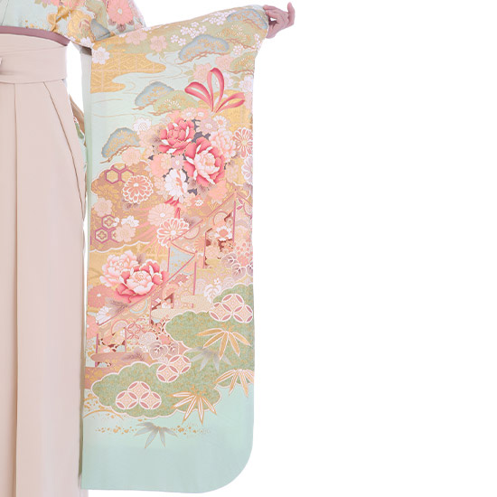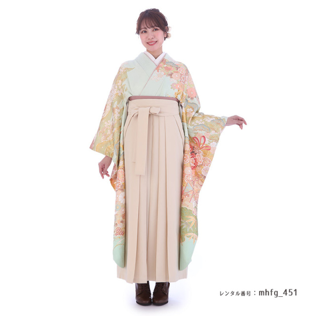 | 付属品 | 着物・袴・長襦袢(半衿付き)・半幅帯・伊達衿・巾着・草履・足袋(プレゼント)・肌襦袢(ワンピースタイプ)・腰紐4本・コーリンベルト・前板・伊達締め2本・衿芯 ※ブーツは付属されませんが、当店の有料オプションからレンタル可能です。 ※ブーツをご利用される場合、草履・足袋は付属されません。 |