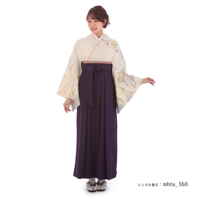 | 付属品 | 着物・袴・長襦袢(半衿付き)・半幅帯・伊達衿・巾着・草履・足袋(プレゼント)・肌襦袢(ワンピースタイプ)・腰紐4本・コーリンベルト・前板・伊達締め2本・衿芯 ※ブーツは付属されませんが、当店の有料オプションからレンタル可能です。 ※ブーツをご利用される場合、草履・足袋は付属されません。 |